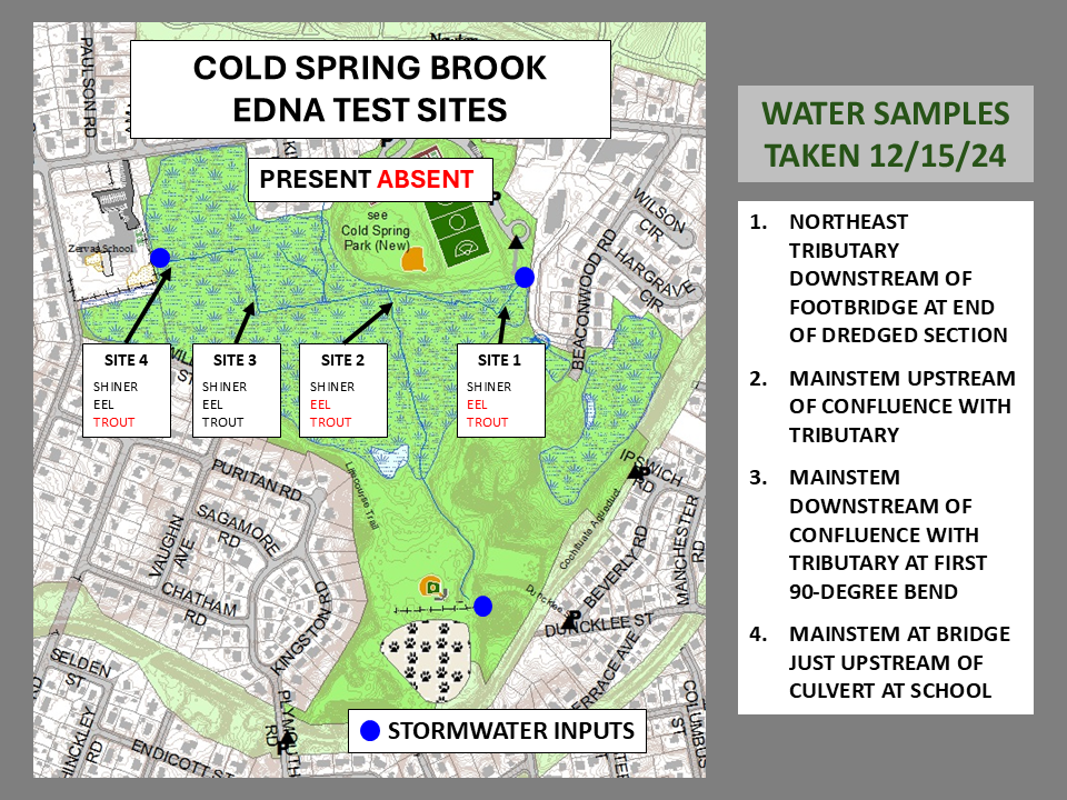 The Massachusetts chapter of NFC has been working with Friends of Cold Spring Park and Newton Conservators to assess the condition of Cold Spring Brook within the park. Using technology provided by Jonah Ventures, NFC collected water samples from 4 sites in the watershed to be tested for eDNA metabarcoding. The results were quite interesting…